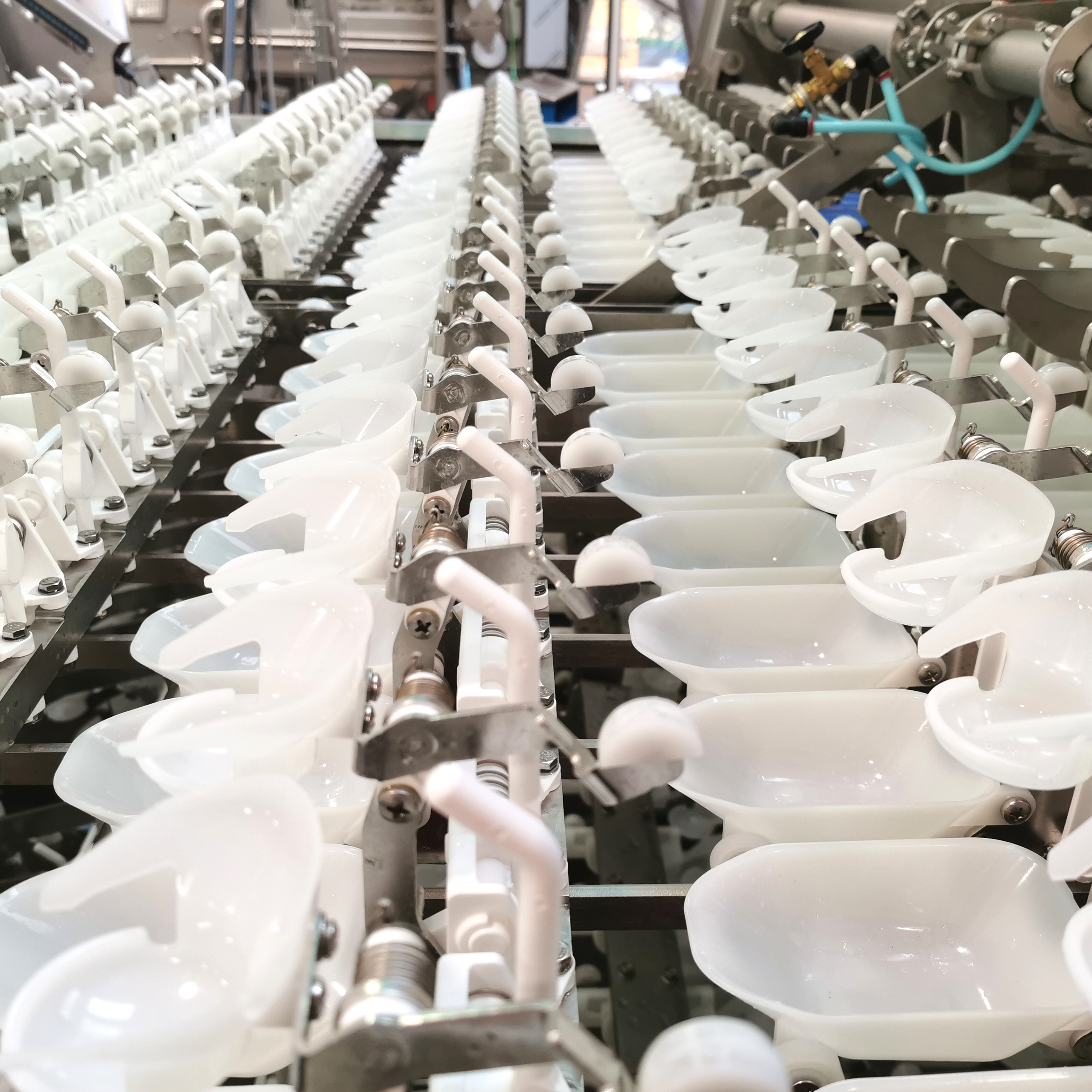 The 18-row egg breaking compartment with 324 optimized cracker units serve 648 receiving and separation cups. Cam-controlled breaker bars allow for the longest possible draining time, maximizing product yield and quality. The machine comes equipped with the OptiManagement system, offering automatic fault tracing, detailed service surveillance with update alarms, and a computer-vision-based egg yolk scanning system. The intelligent automatic cup washing and air purging system ensures optimal cleanliness and efficiency.